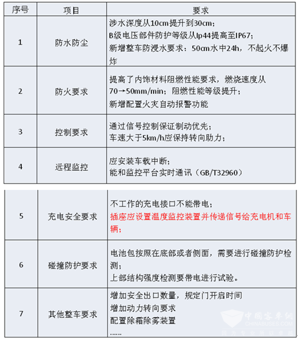 从人员触电防护、火灾防护、事故处理、乘员逃生、整车结构、远程监控、电池热失控、热扩展、客车碰撞等方面增加要求。