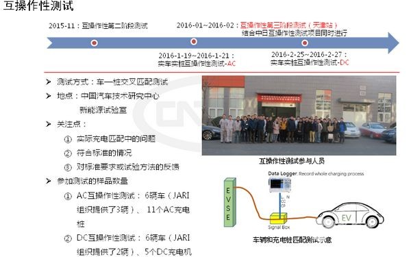 ①AC互操作性测试: 6辆车(JARI组织提供了3辆)、 11个AC充电桩