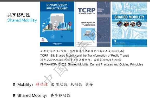 接下来我们讨论正在给整个公共交通行业带来变革影响的共享移动性问题。这是美国科学院交通运输研究所的研究报告,2016年出版的,题目是《共享移动性与公共交通的变革》,变革一词可能是指积极的影响,也可能是负面的影响,现在国内很多城市的公共交通已经出现客流量下降的趋势,排除地铁因素的影响之外,你会发现,人们有更多出行的方式可选择。在美国已经很显著,联邦公共交通局跟美国科学院、公共交通协作研究专门出版了这么一份报告,美国公路运输管理局也出版了一个报告,题目是《共享移动性:当前的实践与设计指南》,也就是说共享移动性在两个行业,公共交通和公路客运行业都带来很大的影响所以说,他们怎么样用移动性的这种来应对变化。