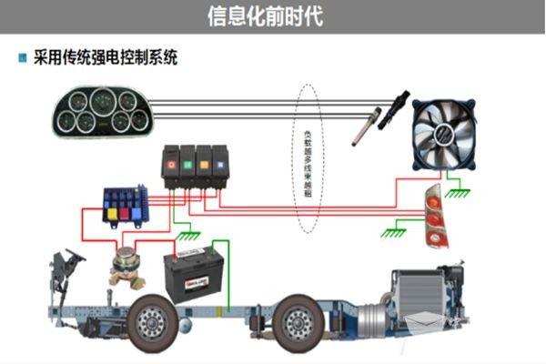 国内客车公交车信息化发展我们简单分成几个阶段,第一个阶段是传统强电控制系统,我们称之为客车信息化前时代,这个阶段有一个明显的特征,所有的电气负载和开关是直接相连的,负载的状态没有办法通过电流的变化进行检测或者进行判断,所以我们没有办法做相应的安全监控。这时候电气负载的安全主要靠保险丝,车辆的安全防范主要靠定期的维护保养。