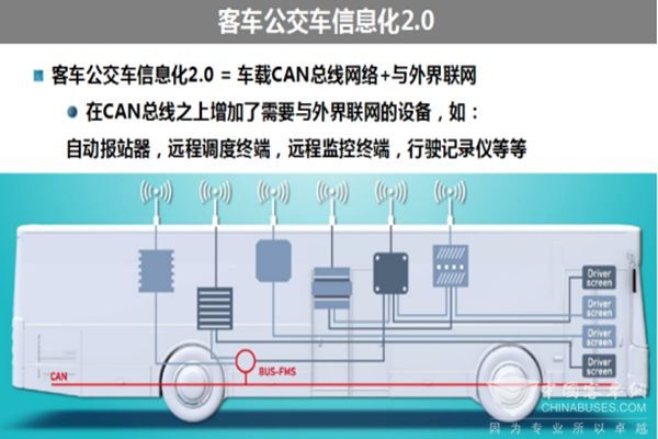 接下来的阶段就是把车载CAN总线与外界进行互联的阶段,我们称之为客车信息化2.0时代,在整车设计上面,我们开发了一些互联互通的设备,比如说像自动报站器,车载通讯终端,这张图上大家可以看到车上多了几根天线,我们可以把这些信息传回我们的后台,与我们后台的系统进行互动。这个时候我们车辆的安全不仅仅由单车决定的,还通过与监控平台联合作战来实现的。同时我们可以通过收集这些信息,进行大数据处理,可以对车辆一些潜在隐患进行预防处理,同样也可以通过对司机的驾驶行为进行分析,分析出哪些行为影响到驾驶安全,然后做一些不良驾驶行为的引导和规避。