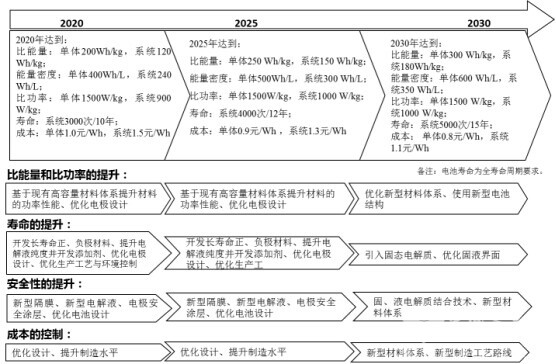 在中国制造2025里面也提到了动力电池能量密度的相关目标要求,2020年电池的能量密度达到300瓦时每公斤,2025年要达到400瓦时每公斤,2030年要达到500瓦时每公斤,依据中国制造2025的相关内容,制定了节能有新能源汽车的7+1技术发展路线图,其中的1就是总的技术发展路线图,7是7个分路线图,电池作为其中一个非常重要的分路线图。这里面从两个方面提的目标,一个是纯电动汽车用的能量型电池,一个插电式混合动力汽车用的能量功率兼顾型电池,大家要着重看一下在2020年提的目标要求,我觉得对电池企业而言挑战性是非常大的。所提的要求不是指标,是目标,是电池企业努力的方向。