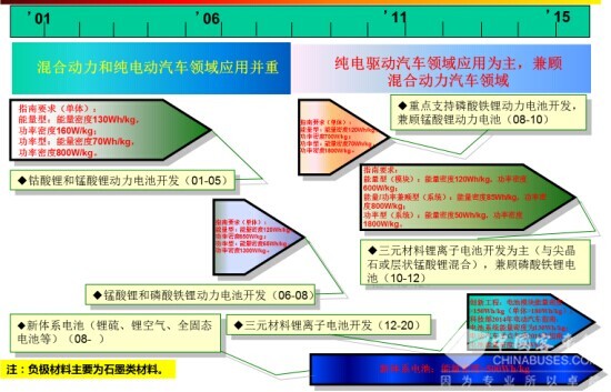 再看一下中国政府的三个五年计划以来动力电池技术路线的变化,主要是锂离子电池的发展变化情况,从它的应用领域来看,还是跟国家对电动汽车技术支持的转变是密切相关的,原来是混合动力和纯电动并重,现在以纯电驱动作为战略取向,从大的角度看混合动力汽车也包括在内。