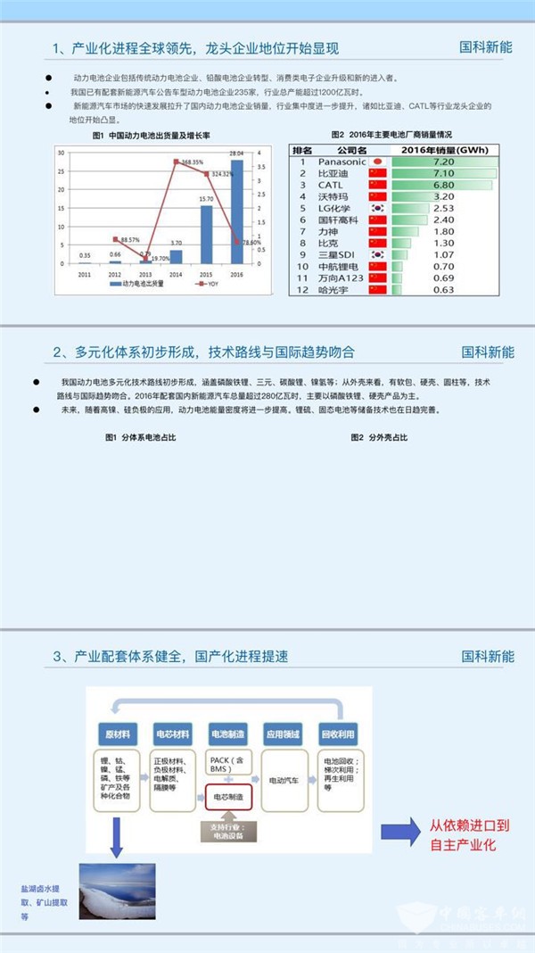 第一,我国动力电池产业化的进程应该说全球领先,龙头企业的地位已经显现出来,他们开始积极的参与到国际竞争中。我讲这种产业化的进程,全球领先,不仅仅是我们大家所知道的规模上,也不仅仅是它的发展速度上,也不仅仅是它的成本降低上,也不仅仅在它的产业链配套上,更重要的是体现在它的实力上。