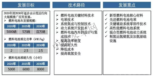 2017年,工业和信息化部、国家发展和改革委员会、科学技术部联合印发《汽车产业中长期发展规划》,燃料电池技术发展路线以2020年、2025年及2030年为三个关键时间节点,依据产品研发-制造验证-批量应用的规划思路,使车用燃料电池电堆的性能、寿命、成本三个关键指标依次达到商业化要求,并且完成电堆及关键材料的批量制造能力建设,满足燃料电池汽车发展需求。