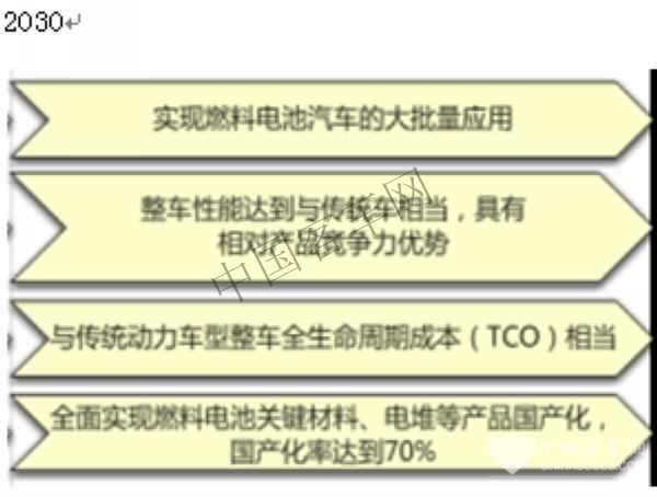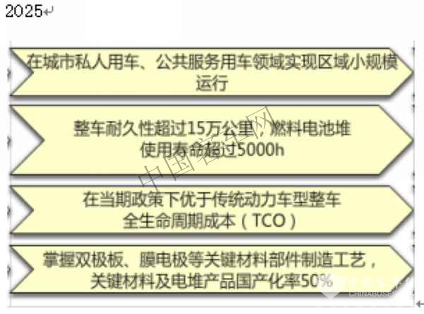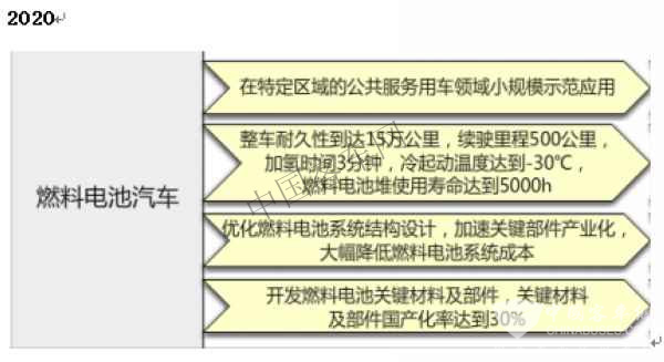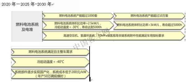1.关键材料、零部件逐步国产化。到2020年,实现燃料电池关键材料批量化生产的质量控制和保证能力;到2025年,实现高品质关键材料、零部件实现国产化和批量供应。