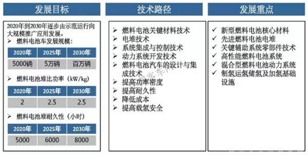2017年4月25日,工业和信息化部、国家发展和改革委员会、科学技术部联合印发《汽车产业中长期发展规划》,燃料电池技术发展路线以2020年、2025年及2030年为三个关键时间节点,依据产品研发-制造验证-批量应用的规划思路,使车用燃料电池电堆的性能、寿命、成本三个关键指标依次达到商业化要求,并且完成电堆及关键材料的批量制造能力建设,满足燃料电池汽车发展需求。