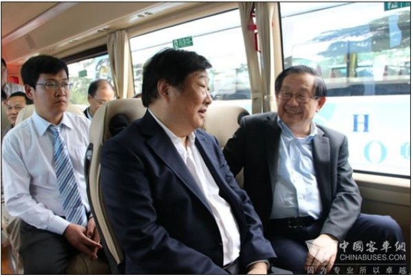 全国政协副主席万钢与潍柴董事长谭旭光共同乘坐体验中通氢燃料高端商务车