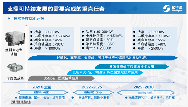 持续的技术创新是保持产业竞争力,推动产业进步的关键,为满足不同阶段市场拓展的需求燃料电池发动机系统需持续向轻量化,高集成、长寿命、强环境适应性发展,要实现这些目标将从系统设计、电堆设计、膜电极材料全面升级,另外为进一步提升产品续航能力,高储氢密度车载氢系统的开发也尤为重要,预计2025年前后70MPa高压Ⅳ型储氢瓶技术将在我国得到应用,同时液氢应用也将初具规模。