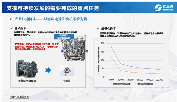 除技术创新外,快速降本也是确保产业健康可持续发展的重中之重。以燃料电池降本为例,一方面可从消除冗余、整合集成、变更材料等维度出发,在持续提升性能的同时推进技术降本,如亿华通在新一代产品上采用了脉冲引射方案,替代传统循环泵,不仅降低了系统重量,也使单台成本降低2万多元;另一方面,加速规模化也是实现降本的有效途径,根据美国能源部对燃料电池系统成本与产量关系的测算,当制造商燃料电池发动机年产量达到50万套时,燃料电池发动机成本可下降至45美元/千瓦,与传统内燃机成本相当。