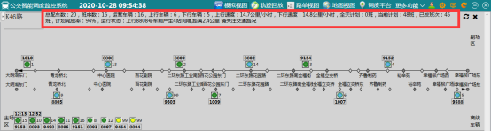 实时展示目前运行车速情况,对主干道车速情况实时分析,便于提醒调度人员了解目前拥堵厉害的路段。并对运行间隔、串车报警、车辆超速情况统计。