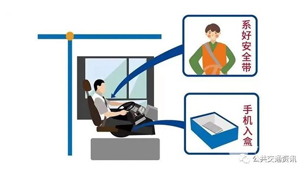 上车手机先入盒,再系安全带,严守法规集中精力,保持良好心态、坚持中速行驶,不超速、不抢行、不超点,做到起步稳、行车稳、停车稳。