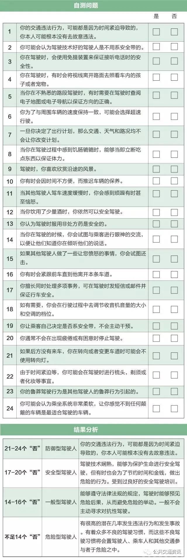 那么,怎样才是“防御型”的公交驾驶员呢?我们准备了一个简单的自测问题表,大家可以根据自己的真实情况回答,完成后就可以知道自己的驾驶水平啦!