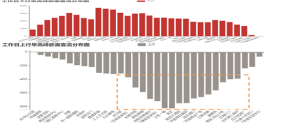 通过高峰客流断面分析及线路乘客OD分布,可以看出这条线路在上行方向线路的北段是需要增加区间运营的,一般可以采用从主站放空车辆至步行街站点处调头运营或是选取部分车辆在高峰期间运营该区段。