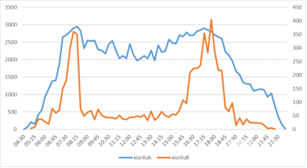 跨线运营是在将某一条线路上某一时段闲置的车辆投放于另一条线路进行运营。(2)案例应用 在实际运营中需要充分分析线路的客流时间分布,来确定哪些时段可用于跨线调度。下图为线路A与线路B的客流时间分布图。线路A除早晚低峰,其余时段客流均处于较高水平,而线路B在平峰及低峰期间客流减少明显,为提高线路A的服务水平及保障线路A车辆加油(气)等,就可以将平峰期间线路B的部分车辆跨线运营于线路A,提高线路B车辆的利用率。
