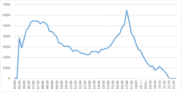编组运营类似于轨道交通的车辆编组,就是将几辆车作为一个编组,在某一时刻同时发出运营。(2)案例应用 一般应用在短时间内客流较高的情况。如下图所示的线路,在早上5:30的时候客流激增,如果按照正常的一辆一辆的发出,由于车辆核载人数的限制,就会有站台滞留乘客的现象,这种情况就需要几辆车编为一组同时发出。