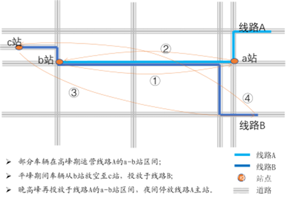 就是将区间运营、大站运营、跨线运营等多种运营模式根据实际情况组合应用。(2)案例应用 如下图所示,线路A在a站与b站之间客流断面较高,为降低车辆满载率,需要在a-b站之间投入区间车辆;车辆在高峰运行结束后,在b无场站,从b占空驶回场站距离较长,则将车辆就近投放于线路B运行,待晚高峰时,再从线路B调整至线路A运营,夜间停放于线路A主站。这就是区间运营与跨线运营相组合的模式。