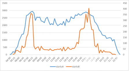 (2)案例应用 在实际运营中需要充分分析线路的客流时间分布,来确定哪些时段可用于跨线调度。下图为线路A与线路B的客流时间分布图。线路A除早晚低峰,其余时段客流均处于较高水平,而线路B在平峰及低峰期间客流减少明显,为提高线路A的服务水平及保障线路A车辆加油(气)等,就可以将平峰期间线路B的部分车辆跨线运营于线路A,提高线路B车辆的利用率。