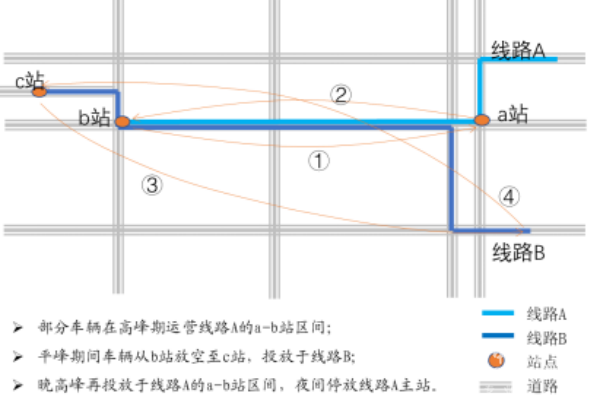 (2)案例应用 如下图所示,线路A在a站与b站之间客流断面较高,为降低车辆满载率,需要在a-b站之间投入区间车辆;车辆在高峰运行结束后,在b无场站,从b占空驶回场站距离较长,则将车辆就近投放于线路B运行,待晚高峰时,再从线路B调整至线路A运营,夜间停放于线路A主站。这就是区间运营与跨线运营相组合的模式。