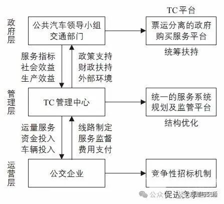 TC组织架构分为政府层、管理层和运营层三个层次。1)政府层:职责是成立TC管理模式工作领导小组,负责组织、协调、督促、落实推行TC管理模式各项工作;2)管理层:成立隶属于交通管理部门的TC管理中心作为管理层,主要职能是公共汽车运营线路规划、服务监督、资金清算以及协调公共汽车场站和站亭站牌规划建设管理,具体可设置综合部、运营规划部、资金清算部、服务监督部等四个部门;3)运营层:由中标的公共汽企业组成,实施线路经营并接受监督,政府通过TC 管理中心对公共汽车企业进行管理,企业运营专注于服务提升,严格按照合同要求提供服务。