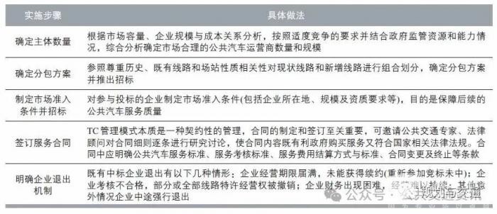 (3)实施流程实施分为五个步骤:确定主体数量,确定分包方案,制定市场准入条件并招标,签订服务合同, 以及明确企业退出机制(见表2)。表2 TC管理模式的实施流程