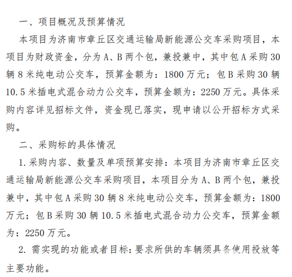 济南市章丘区交通运输局计划采购30辆8米纯电动公交车和30辆10.5米插电式混合动力公交车投入到城区公交运营,投标车型需符合《节能与新能源汽车示范推广应用工程推荐车型目录》的车型,能够在当地入户并保证车辆讲授免征车辆购置税和新能源公交车运营补贴。
