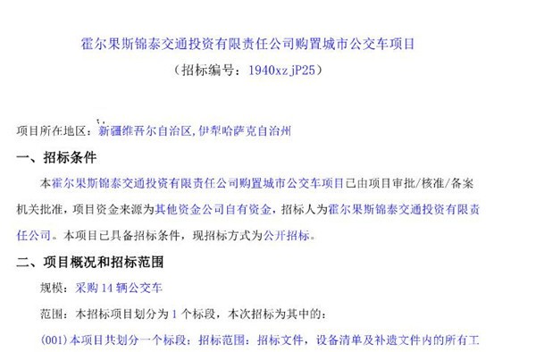 - 威海市昆嵛公共交通运输有限公司购置20辆电动公交车公开招标