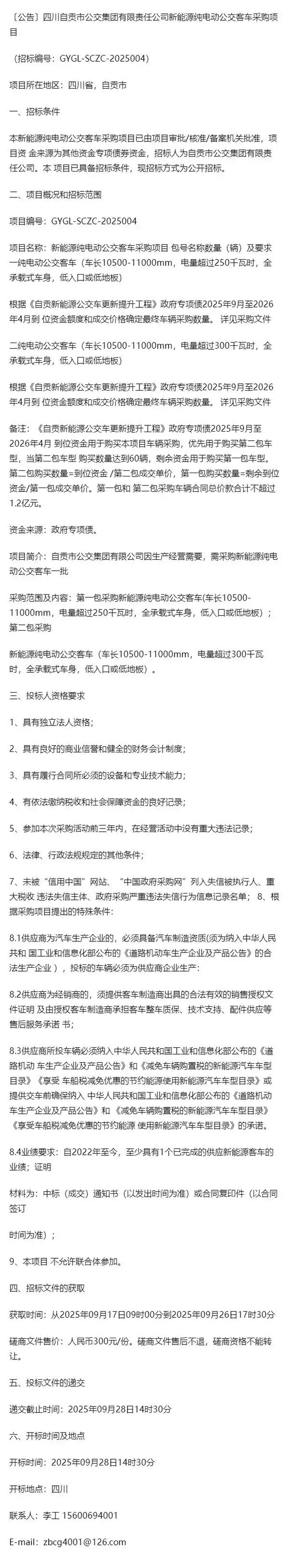 - 山东省滨州公共汽车有限公司2025年新能源纯电动公交车采购公开招标公告