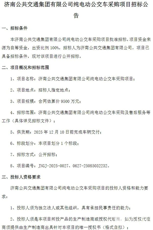 - 山东省滨州公共汽车有限公司2025年新能源纯电动公交车采购公开招标公告