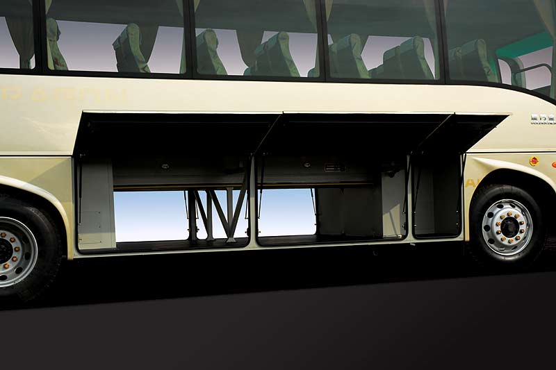 整车结构采用全承载理念,利用计算机三维辅助设计做到了整车强度刚度与整车重量完美平衡。材料上广泛采用镀锌钢板、玻璃钢、铝合金板,大大提高了整车性能。高一级及中级座位数为41+1+1,普通级布置座位数为43+1+1,使该车载客能力达到同级别车中最大,同时拥有超大贯通式行李仓。这些特点使我们的产品拥有同级车中最高的性价比。 该系列底盘是以XML6957为基础平台,经过优化设计而成,可以匹配康明斯、日野、锡柴,玉柴等多款高性能绿色环保发动机。悬架有多片簧和进口六气囊空气悬架可供选择,变速箱和后桥有多种速比可供选择,可满足不同客户不同运行工况的动力性和经济性要求。