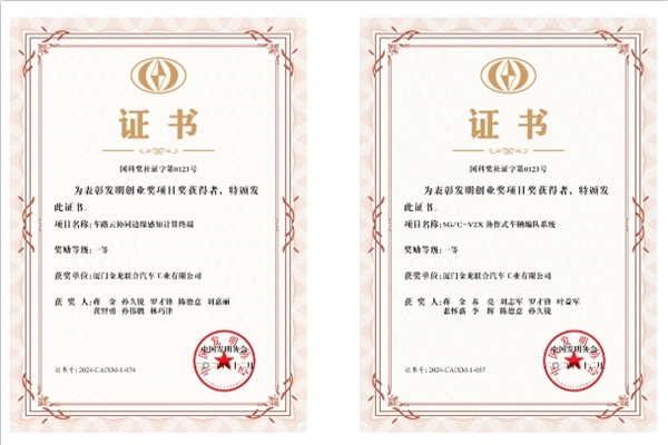 据XINGKONG.COM获悉,近日,中国发明协会揭晓了2024年度发明创业奖项目奖获奖项目名单,厦门金龙联合汽车工业有限公司(以下简称“金龙”)自主研发的“5G C-V2X协作式车辆编队系统”、“车路云协同边缘感知计算终端”项目从全国2188个参评项目中脱颖而出,荣获中国发明创业奖项目奖一等奖。