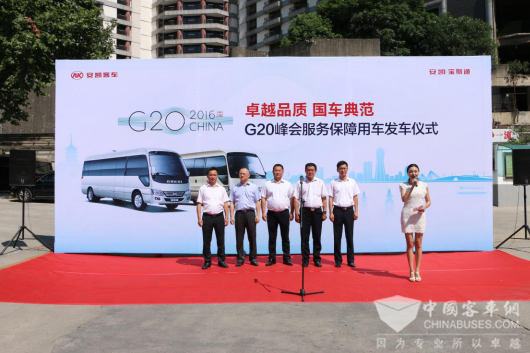 2016年8月24日上午,安凯客车举行了隆重的发车仪式,50台安凯宝斯通客车奔赴杭州,成为G20 峰会服务保障用车,这也是作为“国事老兵”的安凯宝斯通客车继服务习主席出行和完成9.3大阅兵用车任务之后,又一次承担重大国事活动用车任务,将为与会贵宾提供尊贵、安全、舒适的出行服务,展现民族品牌的风采。