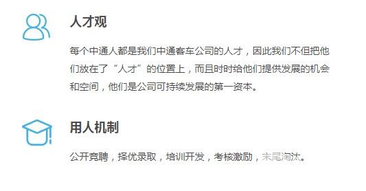 成长:关心员工的需求,给予平等成长的机会,中通客车根据人才的特点,提供最适合于发挥其特长的工作,让每一个人才在中通都能实现自己的人生价值。