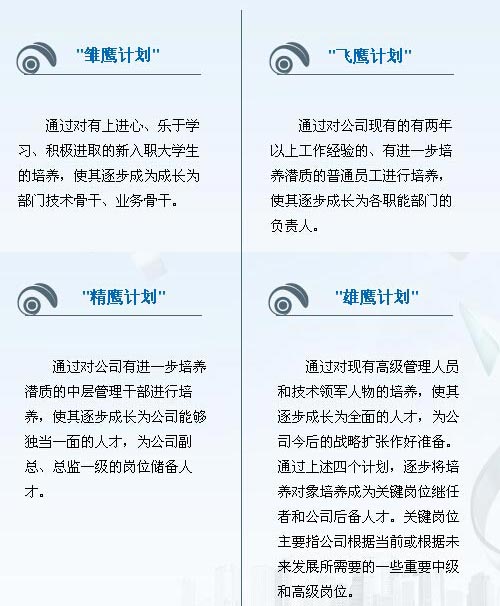 公司战略人才培养体系由“雏鹰计划”、“飞鹰计划”、“精鹰计划”和“雄鹰计划”四个部分组成。由这四个部分共同构成公司战略人才库。