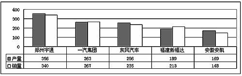1~6月份大型客车企业(27家)累计销量排名前五家企业分别是一汽集团、郑州宇通、常州长江、福建新福达和东风汽车。其中前五家的市场份额占整个行业的56.49%,一汽集团(12.98%)、郑州宇通(12.31%)、常州长江(11.9%)、福建新福达(10.44%)和东风汽车(8.86%)。除一汽集团去年同期无累计销量,无法计算增长幅度外,其余四家均有增长,其中,福建新福达为64.54%增长最为明显。同时,郑州宇通也止跌上涨,为3.32%。多数大型客车生产企业本期累计销量比去年同期呈现不同程度增长。同时,还有五家企业出现销量萎缩。