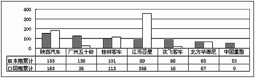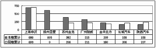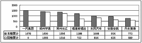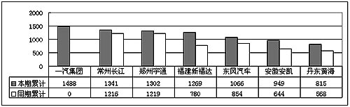 1~6月份大型客车企业(27家)的累计产量与去年同期相比普遍呈上升趋势,部分企业累计产量略有下滑,本期大型客车企业累计产量是11473辆,与同期累计相比增幅为48.44%;多数大型客车生产企业本期累计产量比去年同期呈现不同程度增长,其中以苏州金龙(85.44%)、福建新福达(62.69%)、广州骏威(49.29%)、安徽安凯(47.36%)、丹东黄海(43.49%)和西安西沃(32.14%),广州五十铃本期累计增长为265.63%最为明显。由于一汽集团、扬州亚星、中国重型、四川汽车和镇江汽车去年同期累计数值为零,故无法计算累计增长率,这五家企业以一汽集团为代表,占1~6月份大型客车企业(27家)累计产量的18.97%,是大型客车市场不可忽视的组成部分。同时,还有四家企业出现产量萎缩。